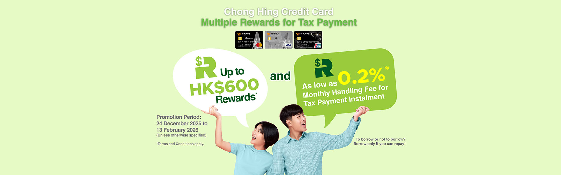From 24 December 2025 to 13 February 2026 (“Promotion Period”), customers who use their Chong Hing Credit Card to pay taxes online and accumulated designated amount below, and also accumulate eligible retail spending of HK$1,500 or above with the same physical credit card during the promotion period, can enjoy up to 100,000 credit card bonus points (“Bonus Points”) (value at HK$500 cash rebate)!
