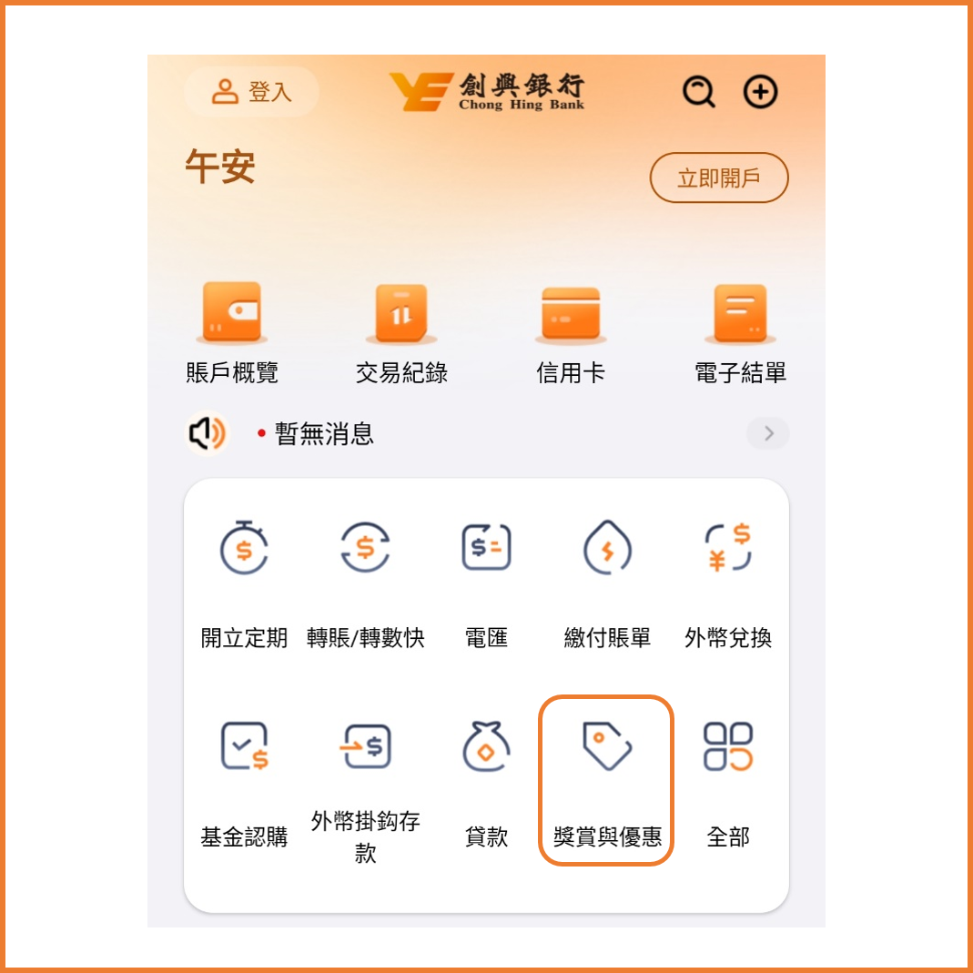 步驟1︰ • 登入創興流動理財應用程式 • 點選「獎賞與優惠」 |