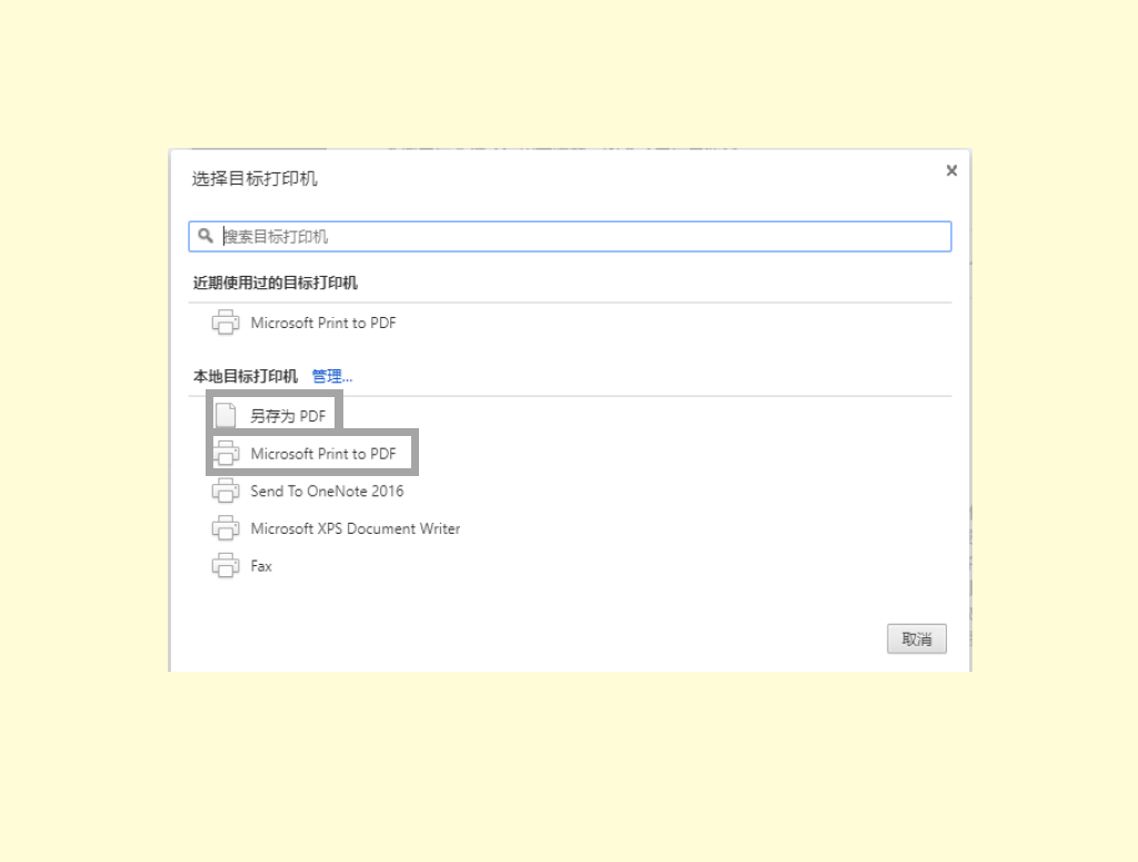 • 选择「另存为PDF」或打印PDF格式的打印机(打印机名称或与图中的不相同,但打印机名称大多含有「PDF」)。