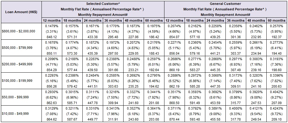 Annualized percentage rate (“APR”) is calculated based on the loan amounts of HK$10,000, HK$50,000, HK$100,000, HK$200,000, HK$500,000 and HK$800,000. The calculation of APR includes handling fee waiver. |