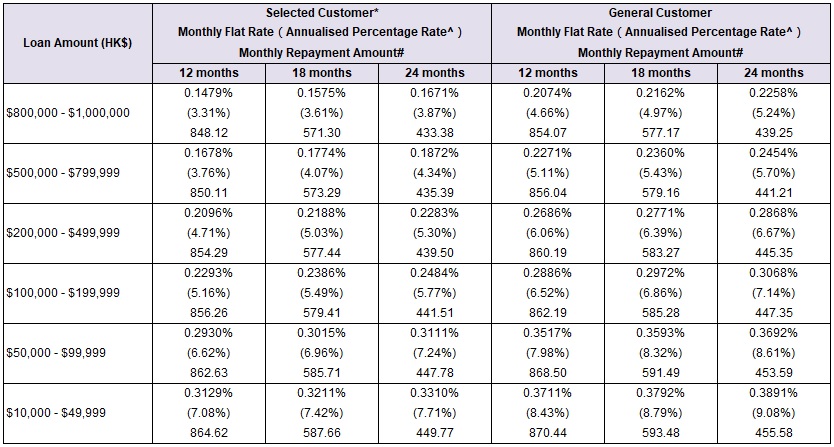 The above interest rate table is for reference only. Chong Hing Bank Limited (the “Bank”) reserves the right to determine the application interest rate and acceptance of a Chong Hing Personal Loan application, which is to be considered on a case-by-case basis in accordance with the customer’s credit, past repayment records and other relevant factors. The Bank has no obligation to disclose the reason of such determination.