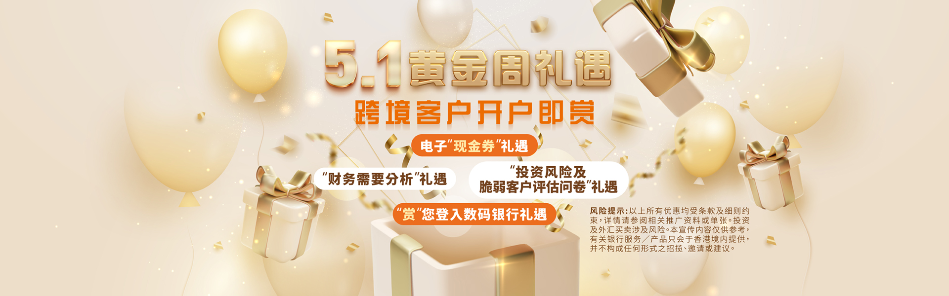 劳动节黄金周将至,创兴银行特别为大湾区跨境客户的多元理财需求,呈献全方位专属理财方案,并隆重推出“5.1黄金周”推广活动,带来多重限时优惠及尊享礼遇,让您尽享高达HK$588丰富奖赏!