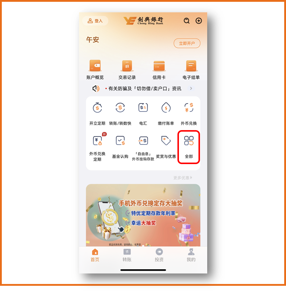 由即日起至2024年12月31日(「推广期」),创兴银行合资格客户登入创兴流动理财每完成1项任务(详情请参阅以下任务内容),即可获得1次抽奖机会。抽奖机会赏上赏!完成指定任务随时有机会中奖!奖赏名额有限,先到先得,额满即止,恕不另行通知。