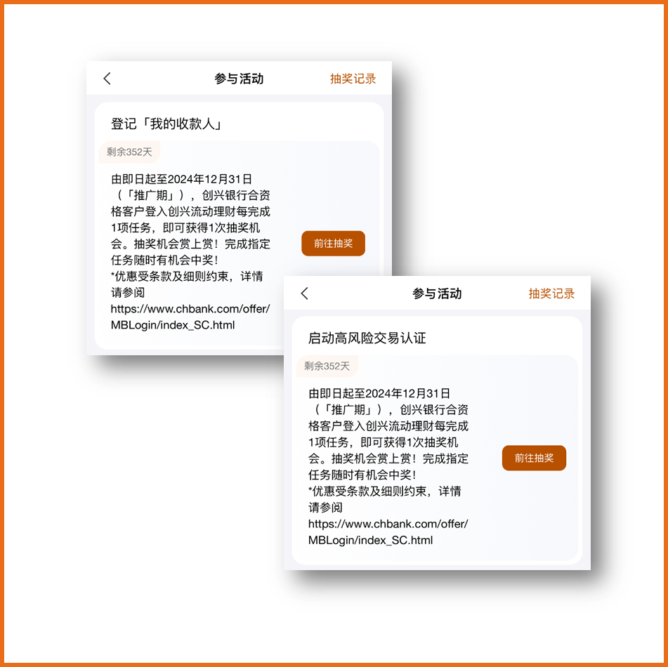 | 2. | 本推广只适用于所有创兴流动理财的个人客户(「合资格客户」),并不适用于公司客户。 | 3. | 于推广期内,合资格客户透过创兴流动理财完成以下指定任务,即可参与抽奖(「抽奖」)。 a) 登记「高风险交易认证」;及 b) 登记「我的收款人」。 尽管本条款及细则有其他之规定,于任何情况下,每位合资格客户(a)成功完成登记「高风险交易认证」,推广期内最多可获得1次抽奖机会;及(b)于同一历月内成功完成登记「我的收款人」最多可获得5次抽奖机会,推广期内最多可获得10次抽奖机会。 |