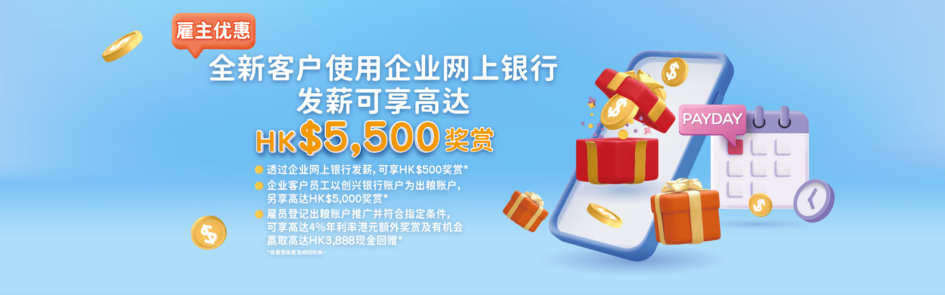 由2026年2月16日至2026年6月30日,客户使用创兴银行有限公司(「本行」)企业网上银行批量发薪服务可享高达HK$5,500现金奖赏。