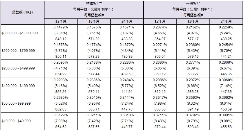 实际年利率以贷款额HK$10,000、HK$50,000、HK$100,000、HK$200,000、HK$500,000及HK$800,000计算,当中包括获豁免的全期手续费。