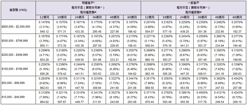 適用之實際年利率由3.31%至27.40%,而還款期由12至60個月。實際年利率乃根據香港銀行公會所載的有關指引計算,並已被約至小數後兩個位。實際年利率是一個參考利率,以年化利率展示出包括銀行產品的基本利率及其他費用與收費。個別客戶之實際年利率或有差異,最終獲批之私人貸款額及/或利率將按客戶的財政狀況及信貸調查結果而釐定,本行保留決定私人貸款額、利率及最終批核結果之最終權利,無須披露原因,對客戶及申請人具約束力。 參考例子:以私人貸款額港幣2,000,000元、每月平息0.1479%及還款期12個月計算,實際年利率為3.31%(豁免所有手續費)。 |