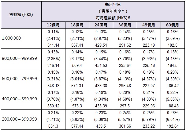 ^ 實際年利率以貸款額HK$200,000、HK$400,000、HK$600,000、HK$800,000及HK$1,000,000計算,當中已包括獲豁免的全期手續費。