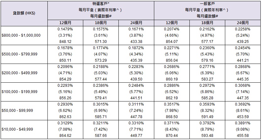 實際年利率以貸款額HK$10,000、HK$50,000、HK$100,000、HK$200,000、HK$500,000及HK$800,000計算,當中包括獲豁免的全期手續費。